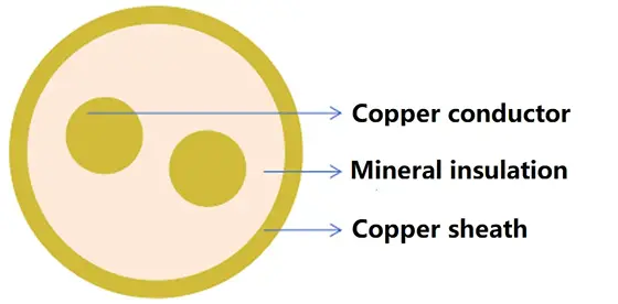 ສາຍ insulated ແຮ່ທາດແມ່ນປະກອບດ້ວຍ conductor ທອງແດງ, ຝຸ່ນ magnesium oxide insulation ແຮ່ທາດແລະກາບທອງແດງ. ເມື່ອໃຊ້ສາຍເຄເບີ້ນໃນໂຮງງານທີ່ທອງແດງຖືກກັດກ່ອນ, ສາມາດເພີ່ມຊັ້ນນອກຂອງ polyvinyl chloride (PVC) ໄດ້. ໃນອາຄານຫຼືສະຖານທີ່ໃຕ້ດິນທີ່ຄວາມງາມຫຼືການເຂົ້າເຖິງງ່າຍແມ່ນສໍາຄັນສໍາລັບສາຍ, ສາມາດເພີ່ມກາບນອກທີ່ບໍ່ມີ halogen, ຄວັນໄຟຕ່ໍາ.