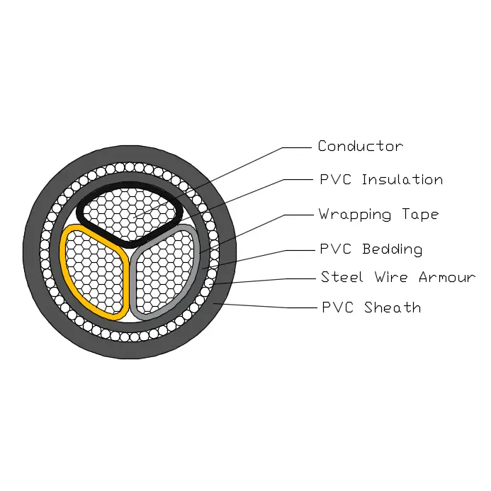 ສາຍໄຟຟ້າ BS 6346 ປະກອບດ້ວຍຕົວນໍາທອງແດງ T1R, insulation PVC, ຜ້າປູ PVC, ເກາະເຫຼັກກ້າແລະກາບ PVC.