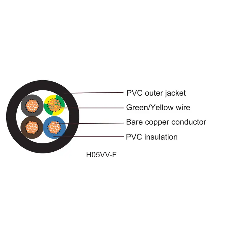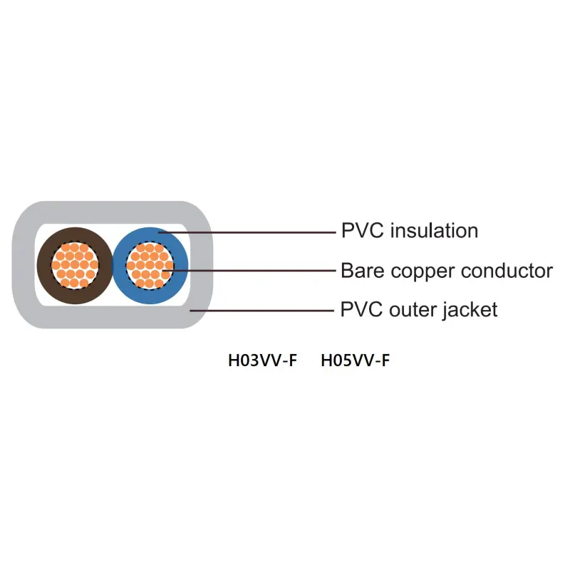 H05VV-F, H05VVH2-F, H03VV-F, H03VVH2-F ແມ່ນປະກອບດ້ວຍຕົວນໍາທອງແດງຊັ້ນດີຊັ້ນ 5, insulation PVC ທີ່ບໍ່ມີທາດນໍາແລະກາບ.